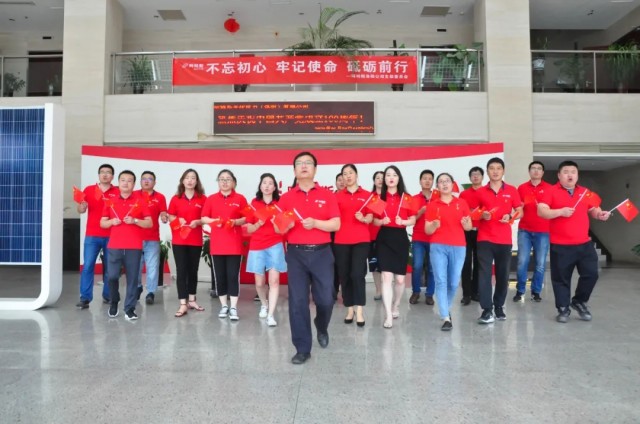 聽到熟悉的樂曲響起,阿特斯光伏電力(洛陽(yáng))有限公司的黨員們從各個(gè)辦公室走出,隨著節(jié)拍舞動(dòng)手中的小國(guó)旗,帶著滿腔的熱忱、昂揚(yáng)的斗志,高聲唱起“他指給了人民解放的道路,他引導(dǎo)中國(guó)走向光明......”