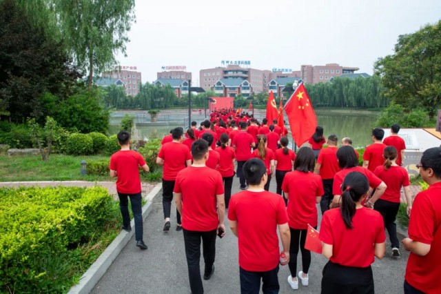 蔚藍(lán)的天空下,闊大的中心湖平臺上,一面鮮艷的黨旗高高聳立。兩名旗手高舉黨旗和國旗,沿著炎黃科技園黨建長廊向平臺飛奔而來。
